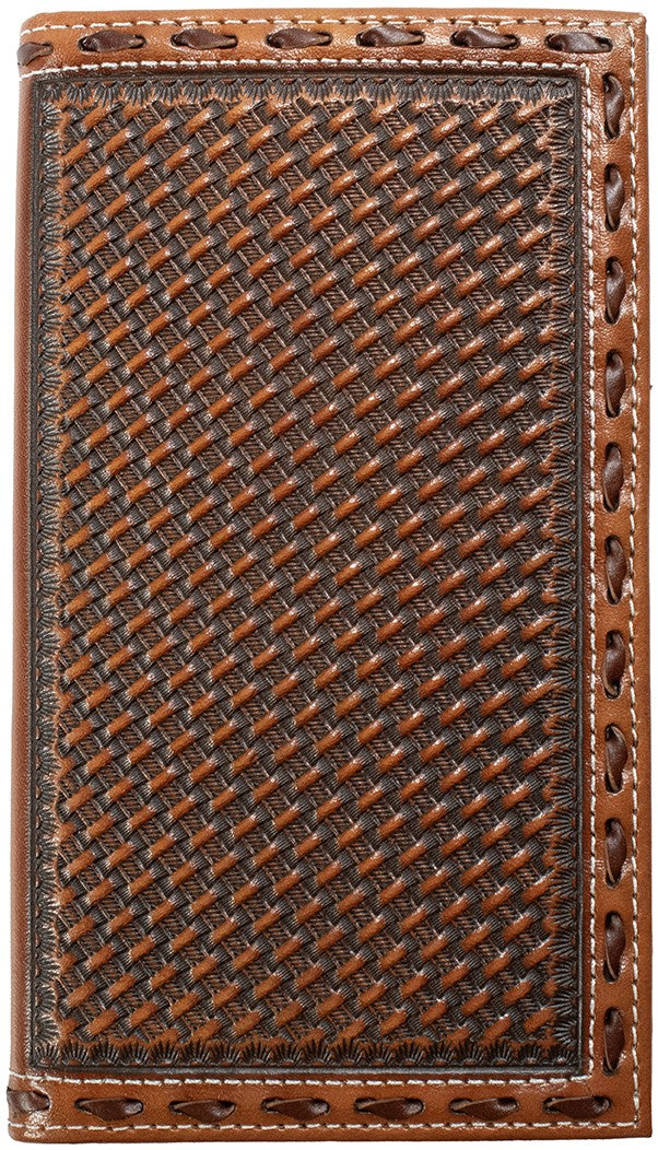 This classic 3D trifold rodeo wallet is genuine leather. Embossed basket weave design with twisted brown buck lacing. Multiple card and cash slots, multiple checkbook holders, pen holder and ID window on the inside.