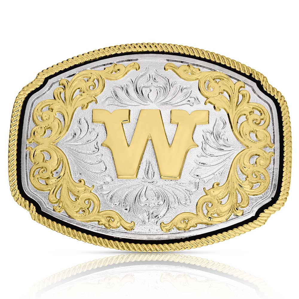 Personalize your style with the Silver Engraved Gold Initial Buckle. This buckle features a gold tone initial as the center piece. Silver engravings create the backdrop for the buckle. Gold tone filigree surrounds the initial in the center, creating a mesmerizing look. A gold tone rope border completes the design. There is only one you, show off your individuality with a unique initial buckle. This cast buckle has a standard 1.5 inch belt swivel.