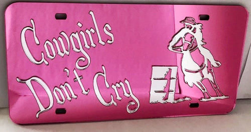 "Cowgirls Don't Cry" Barrel Racer Mirrored License Plate Pink Dark
