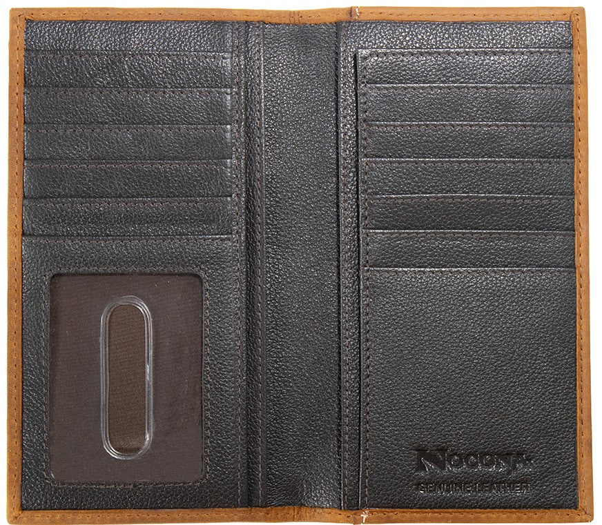 This Nocona rodeo wallet is genuine leather. It features a brown rowdy body with aged bark border that is accented with boot stitching. Multiple card and cash slots, checkbook slot and ID window on the inside.
