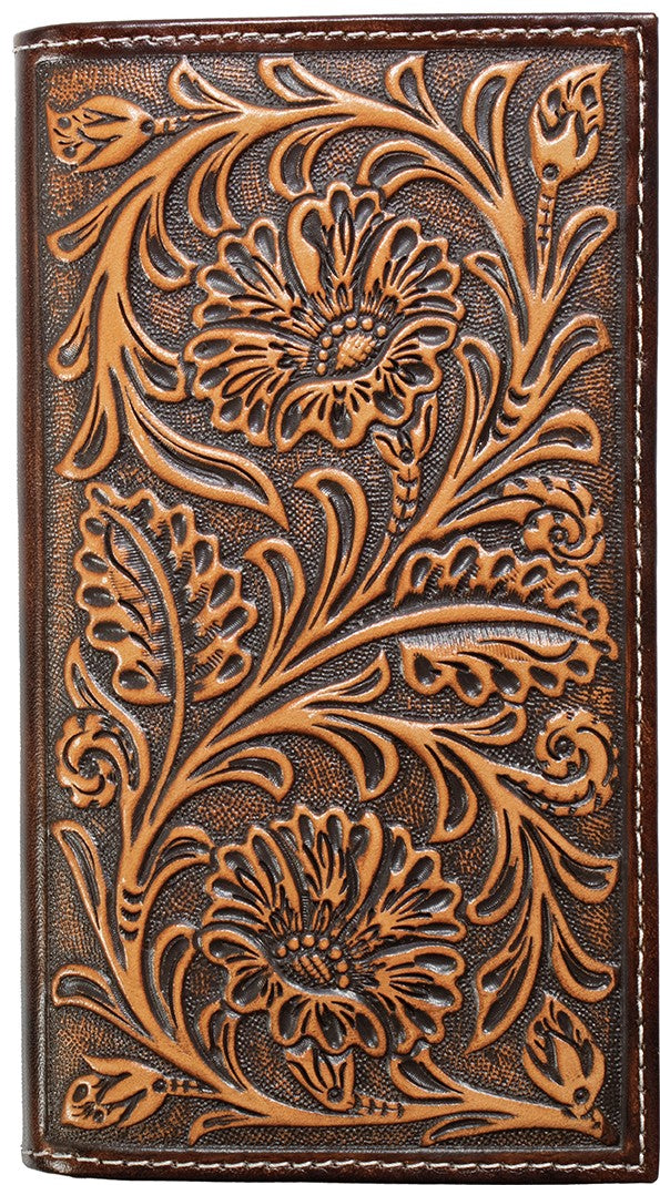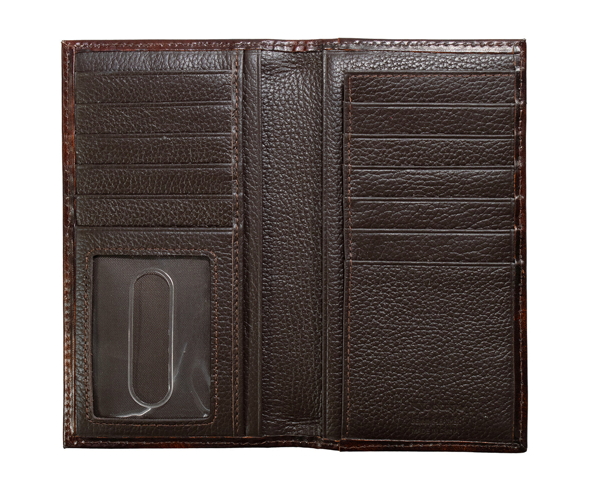 This Nocona rodeo wallet has a brown leather body with floral embossing. Multiple card and cash slots, checkbook slot and ID window on the inside.