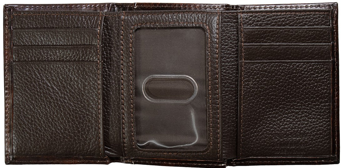 This Nocona tri-fold wallet has a brown leather body with floral embossing. Multiple card and cash slots, checkbook slot and ID window on the inside.
