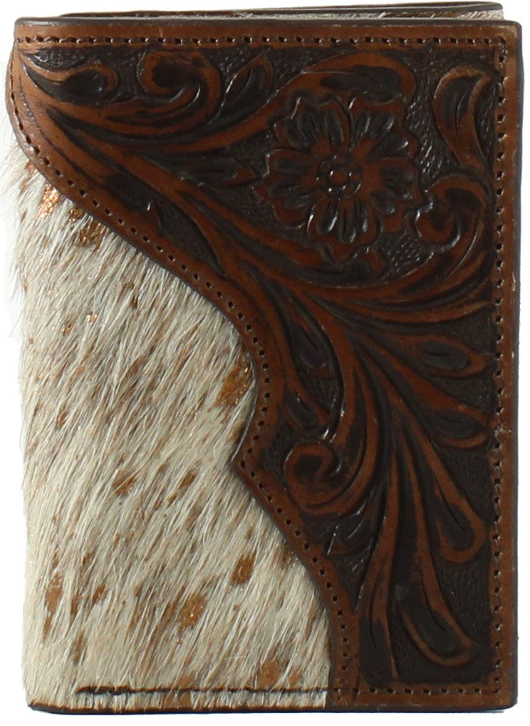 "Nocona" Western Floral Embossed Leather & Calf Hair Brown Tri-Fold Wallet